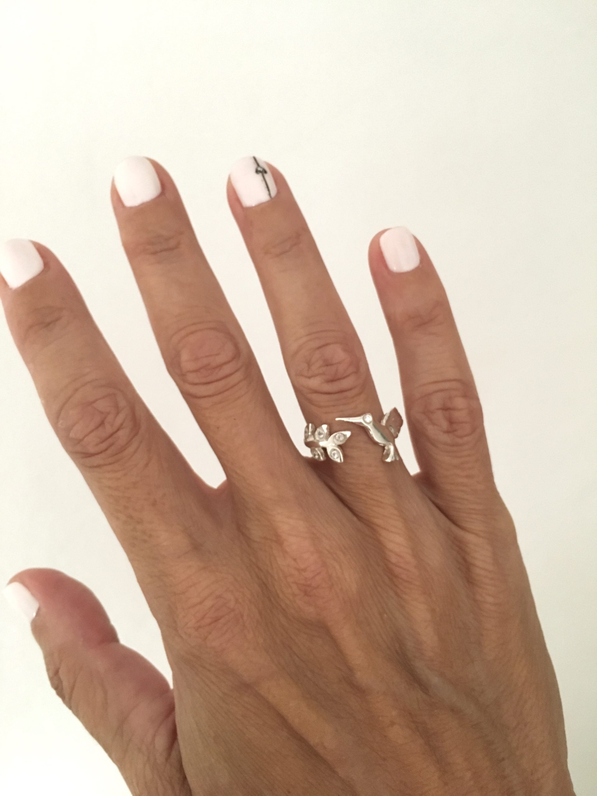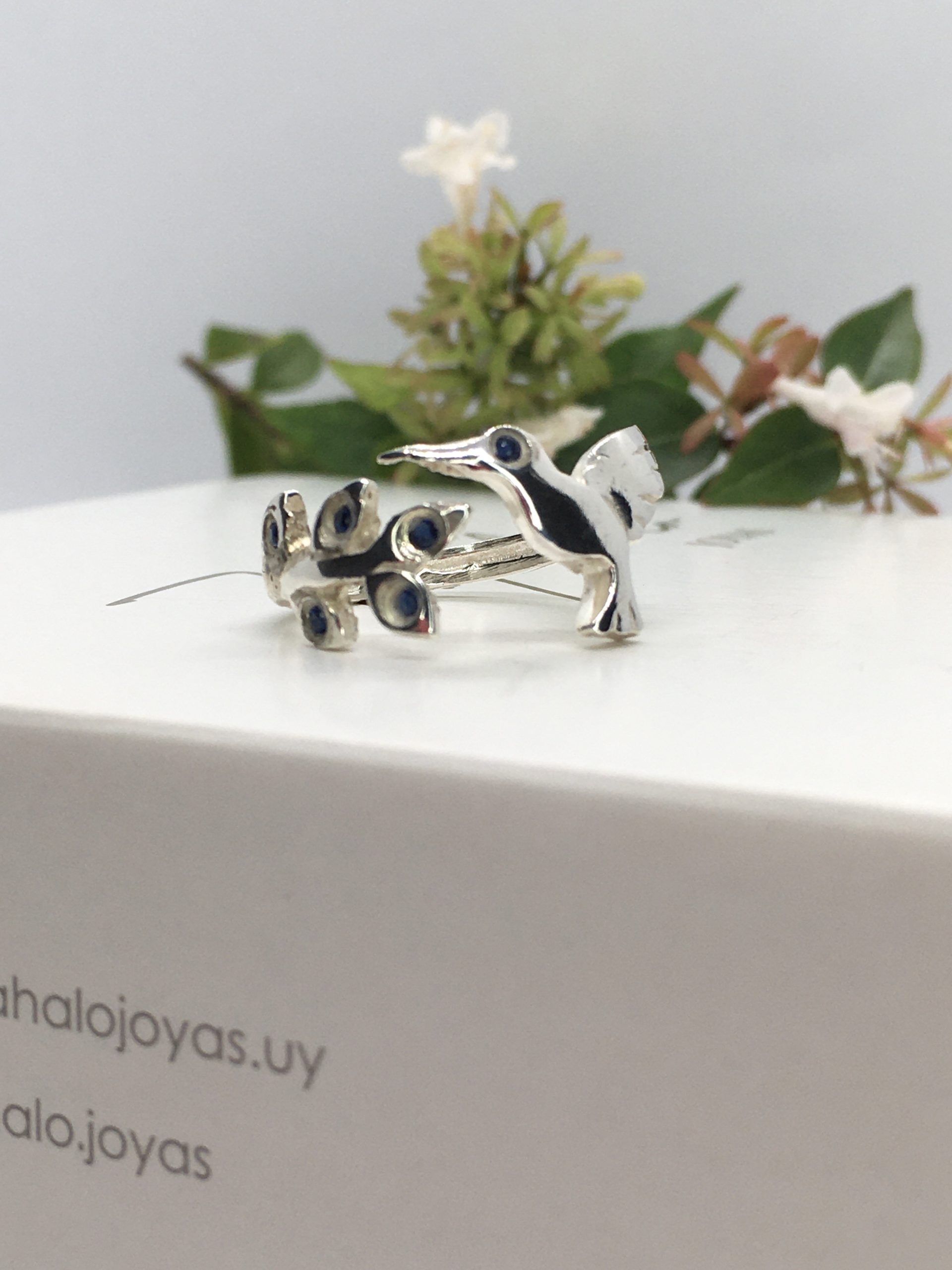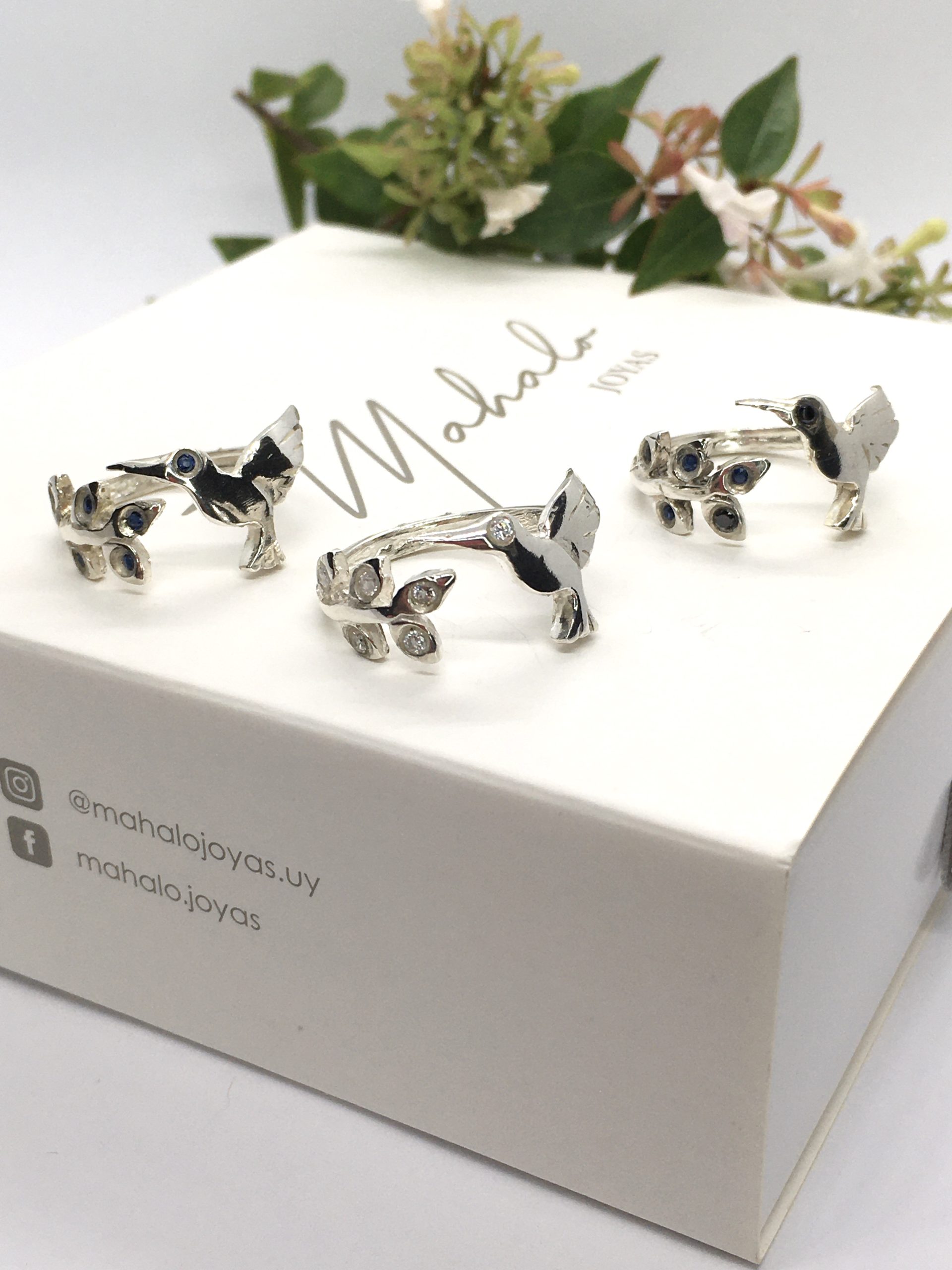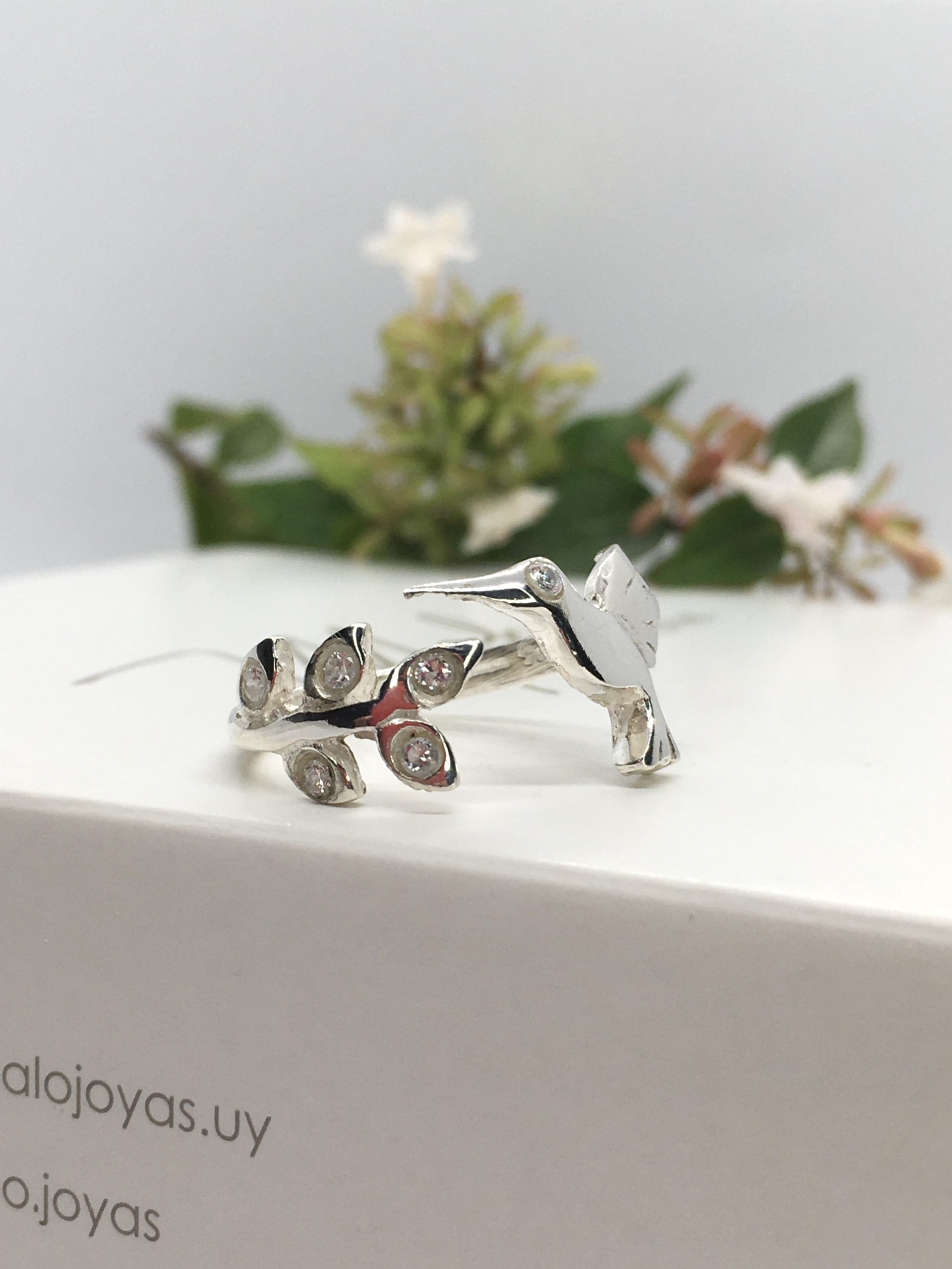Anillo en Plata 925, abierto en la parte superior, en forma de colibrí y una ramita con circonias.