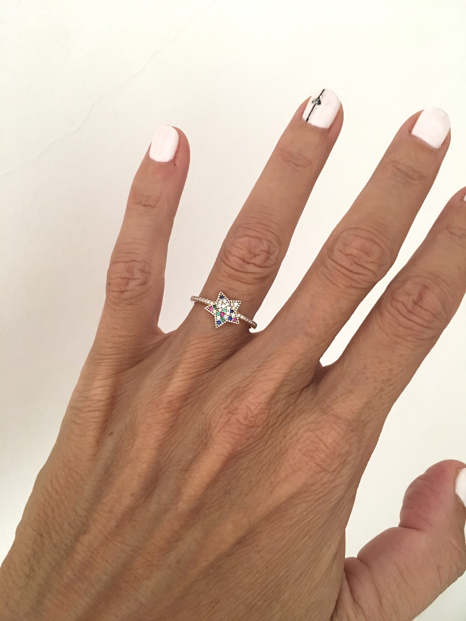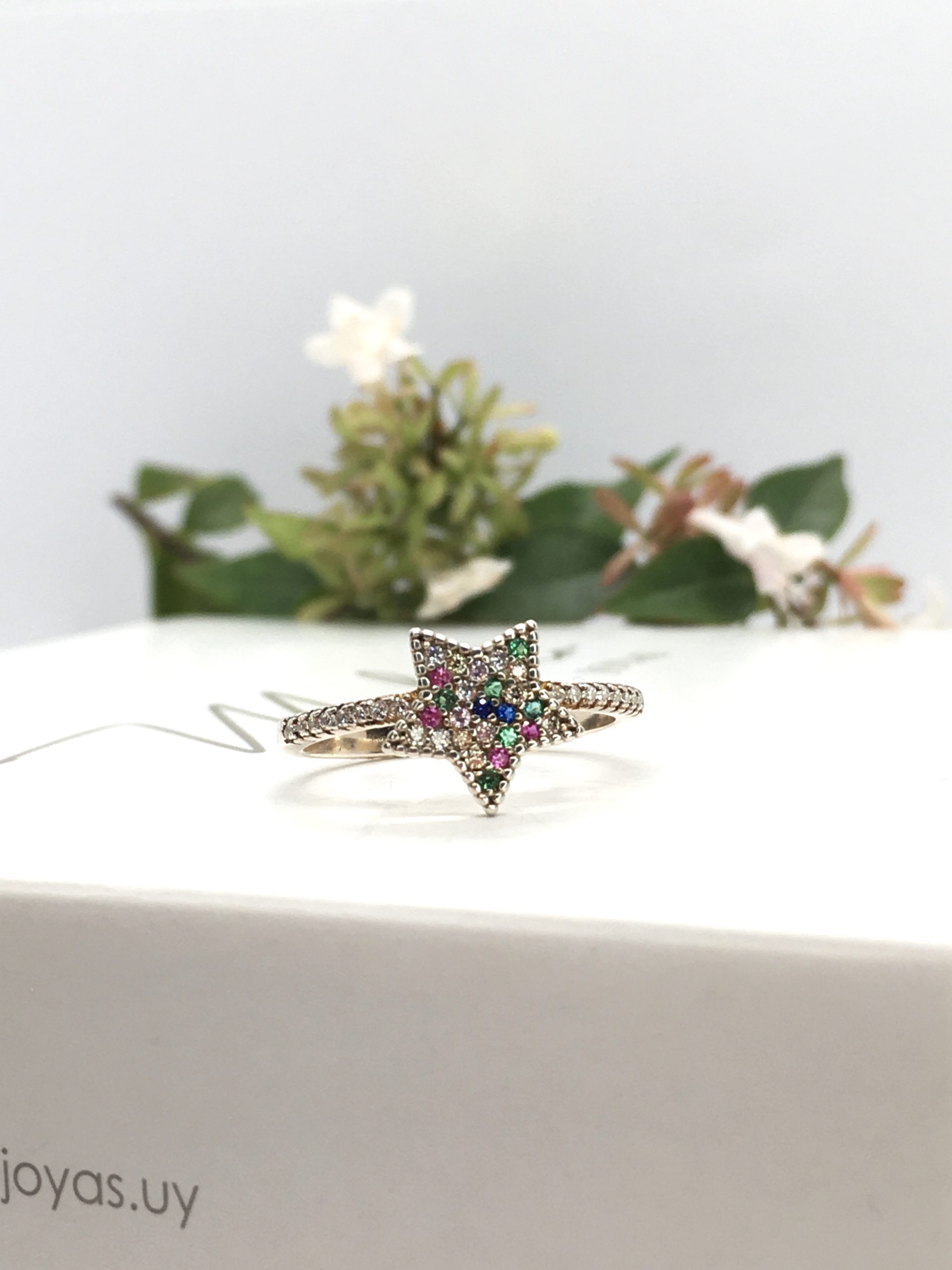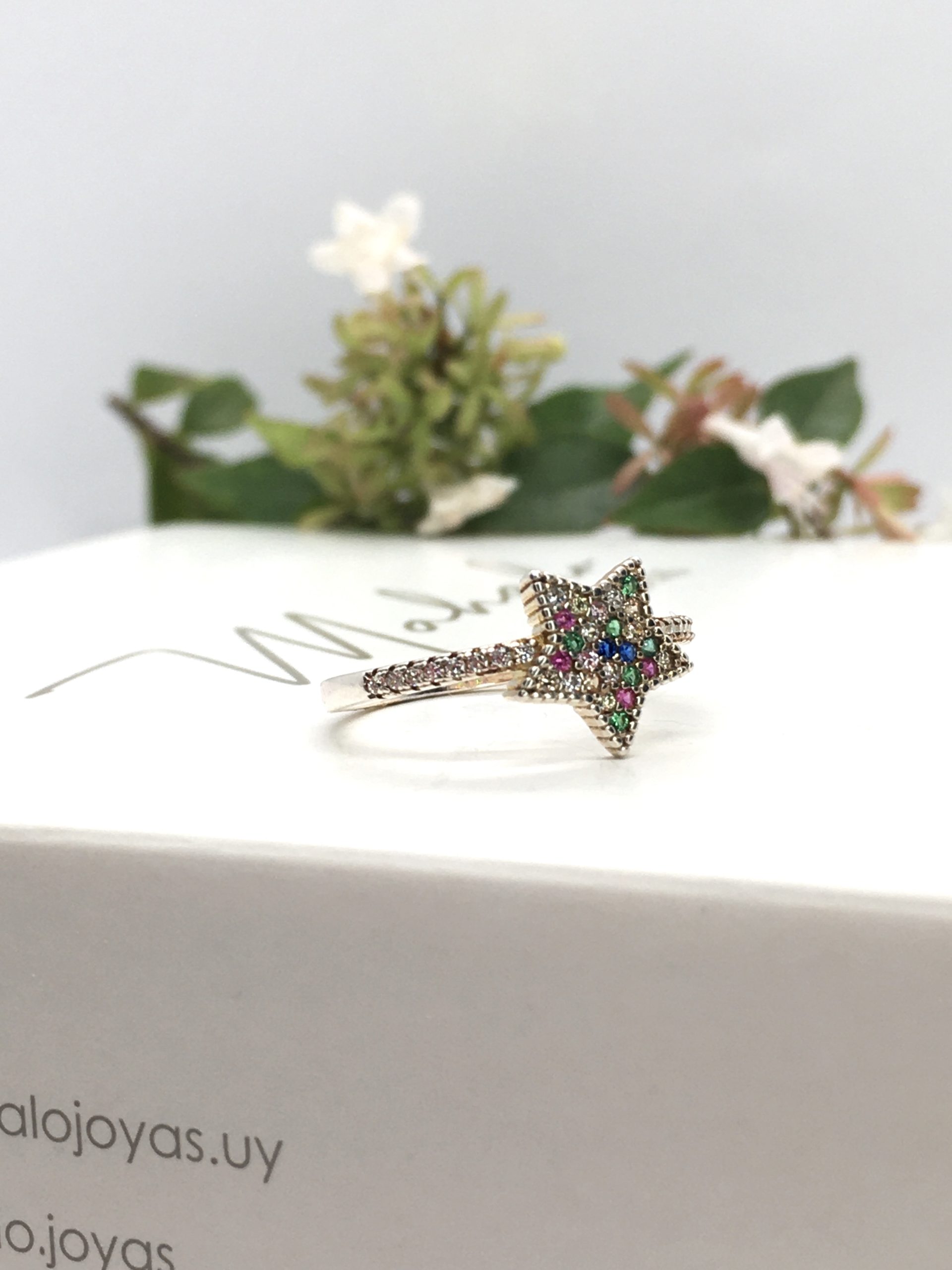 Anillo delicado en Plata 925 con estrella en micropavé de circonias blancas y multicolores. Circonias blancas a cada costado de la estrella.