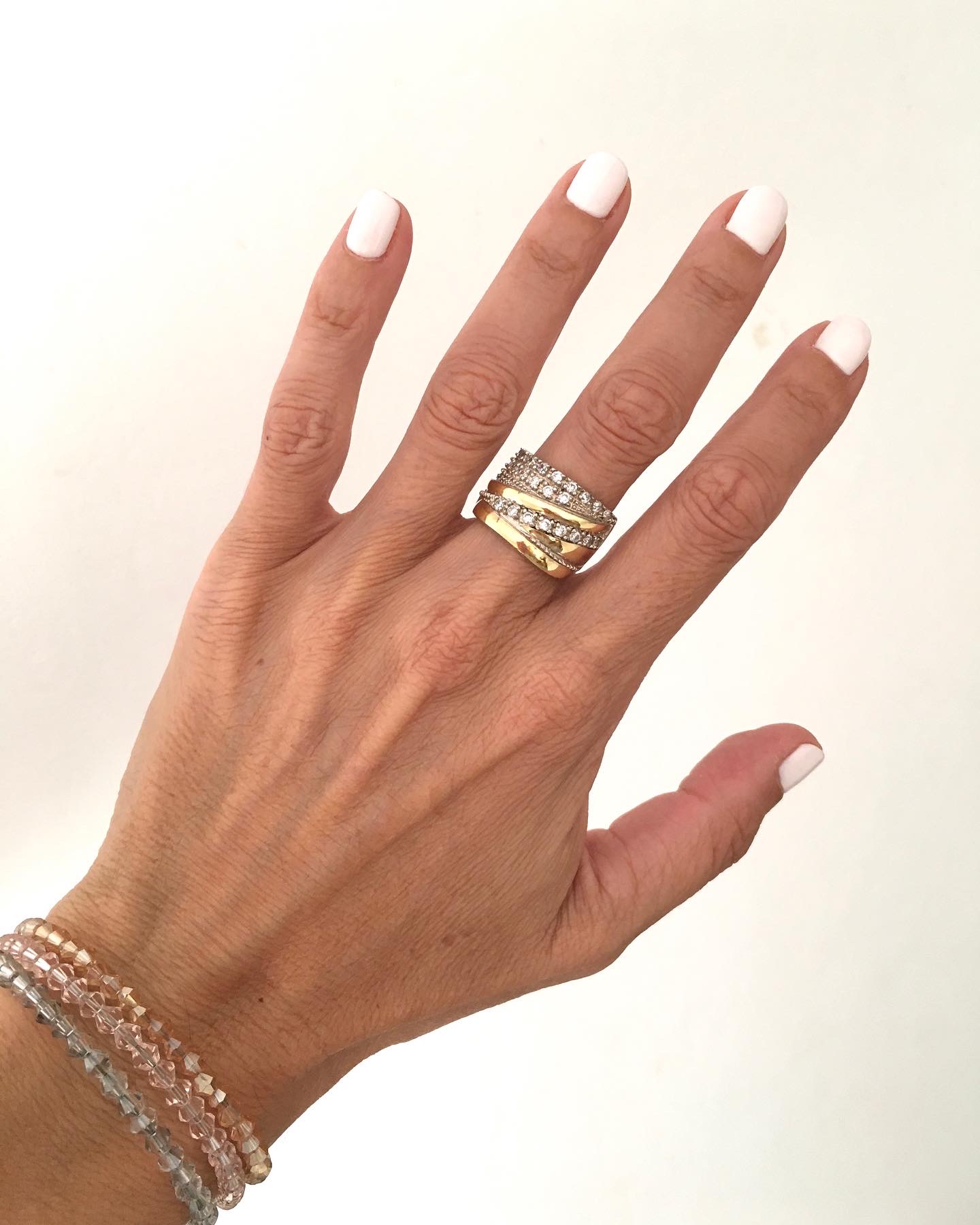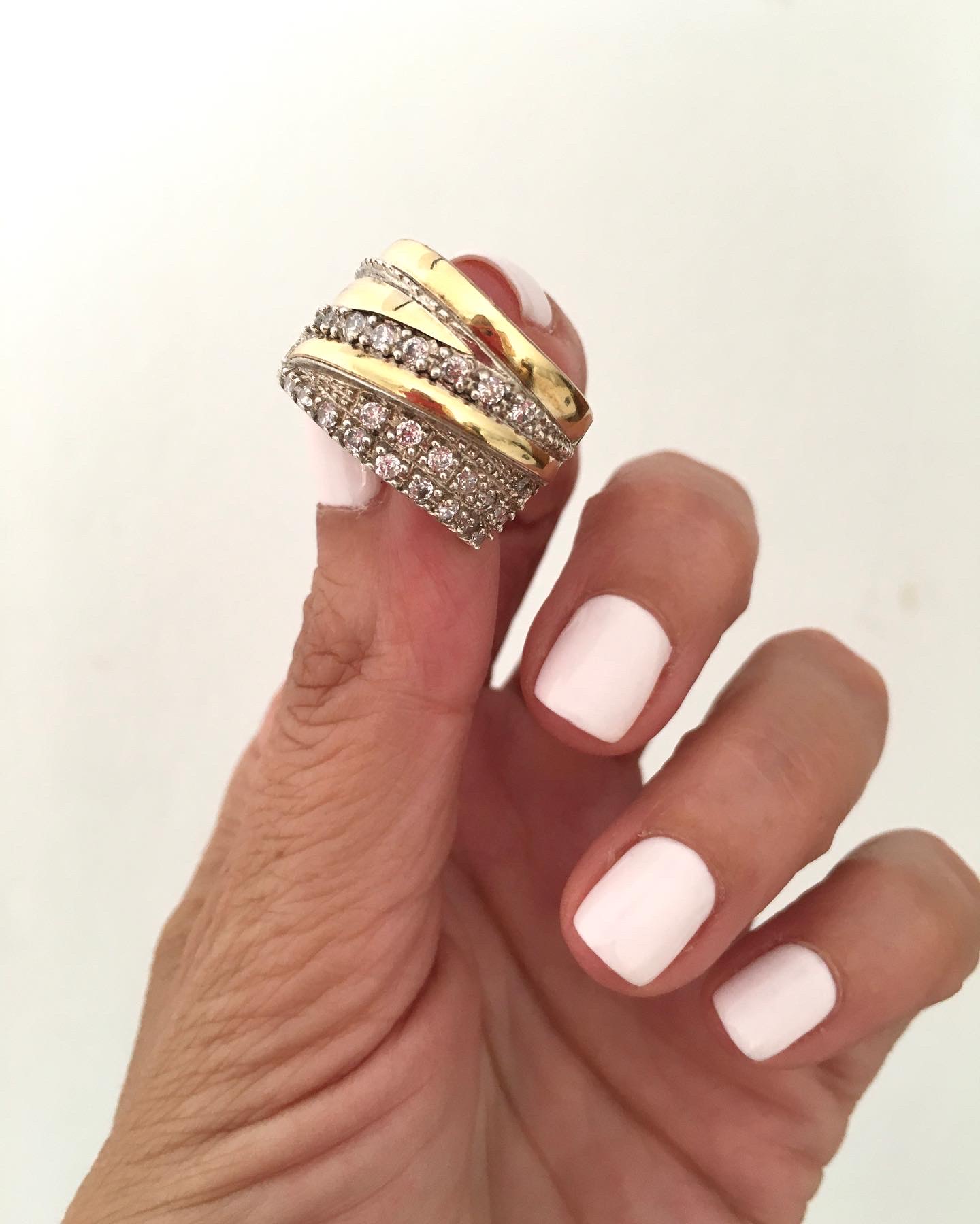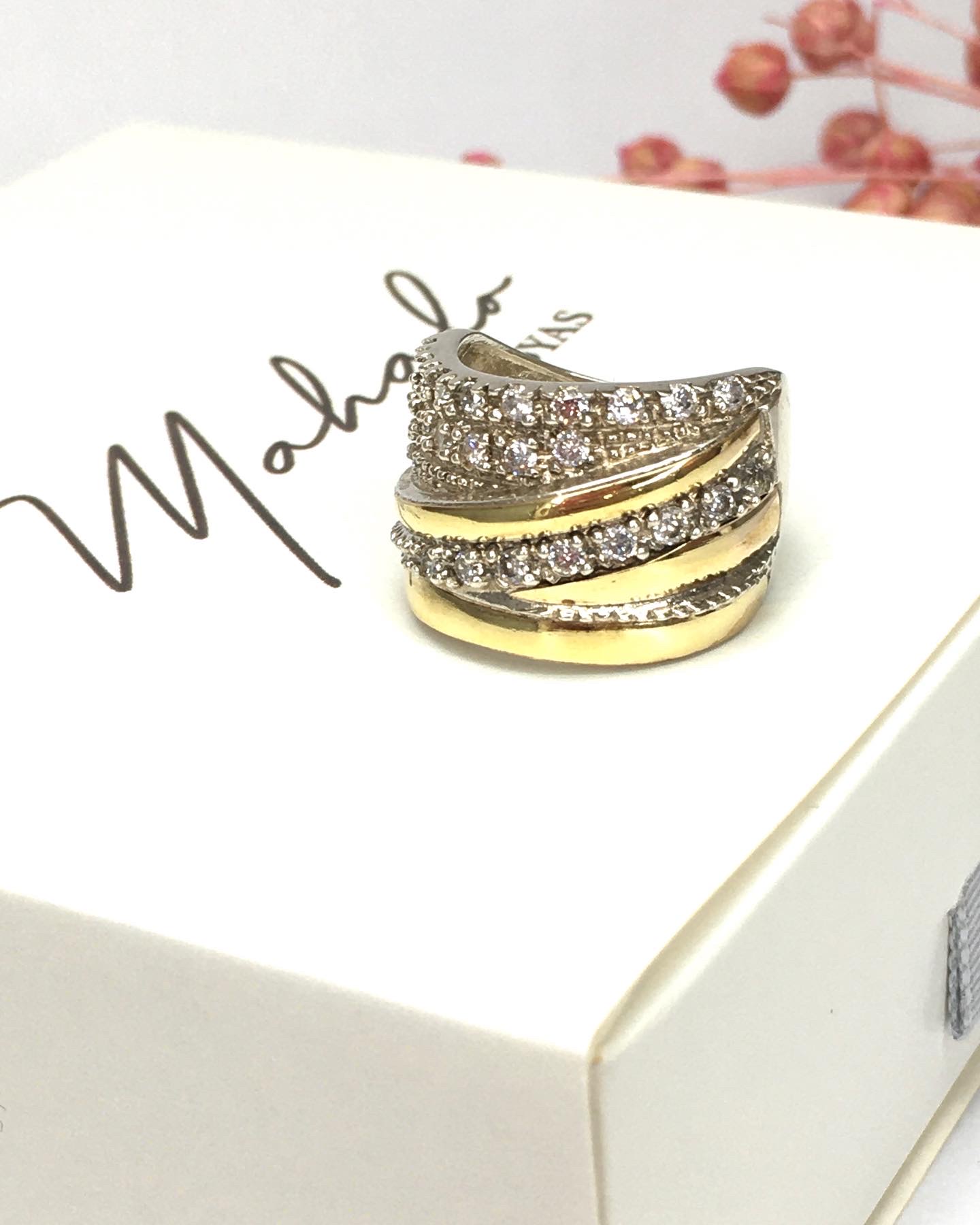 Anillo confeccionado en Plata 925 con apliques en oro y circonias engarzadas, ideal para usarlo solo y captar todas las miradas, hará que tus manos se vean más hermosas aún.