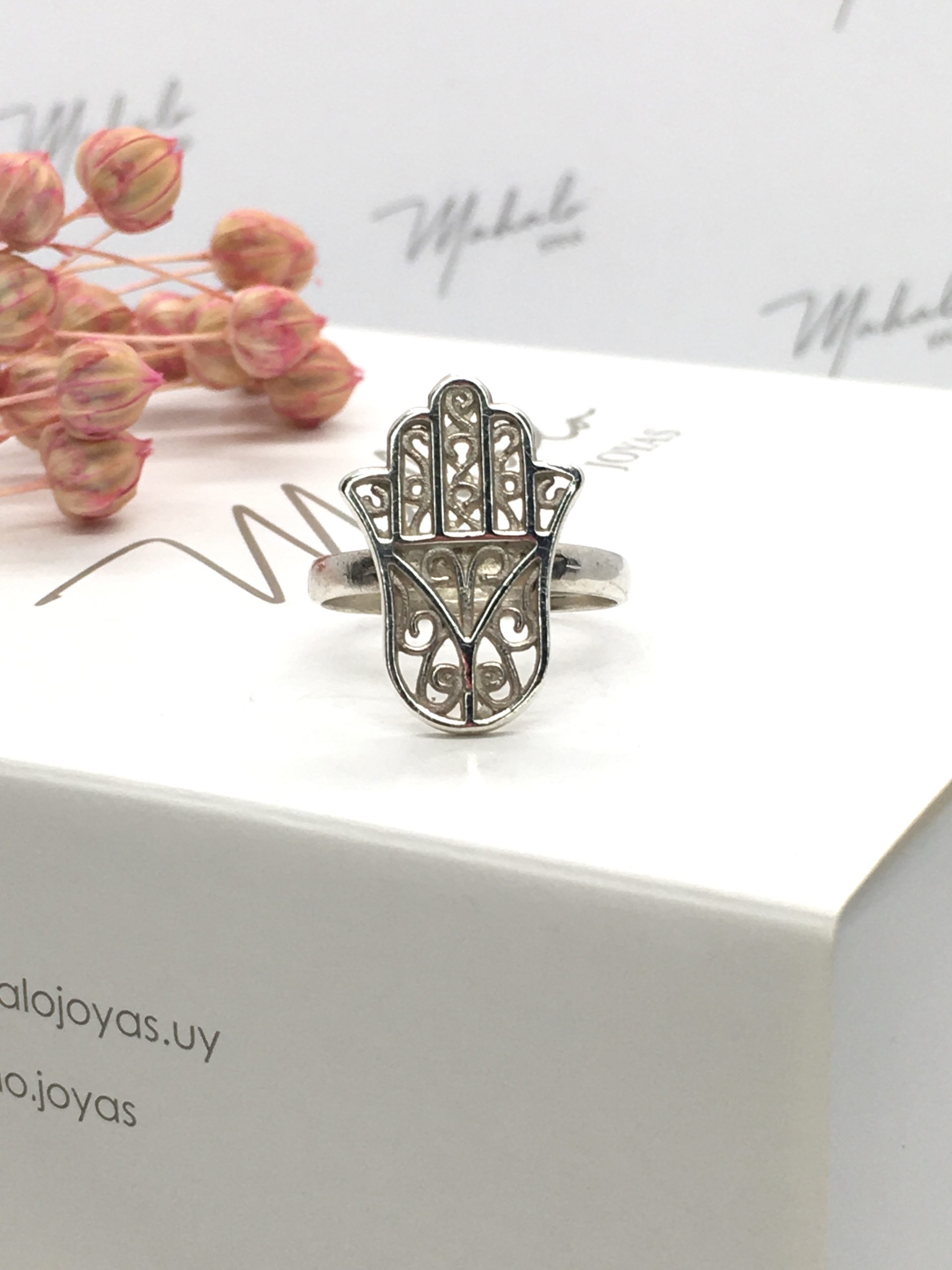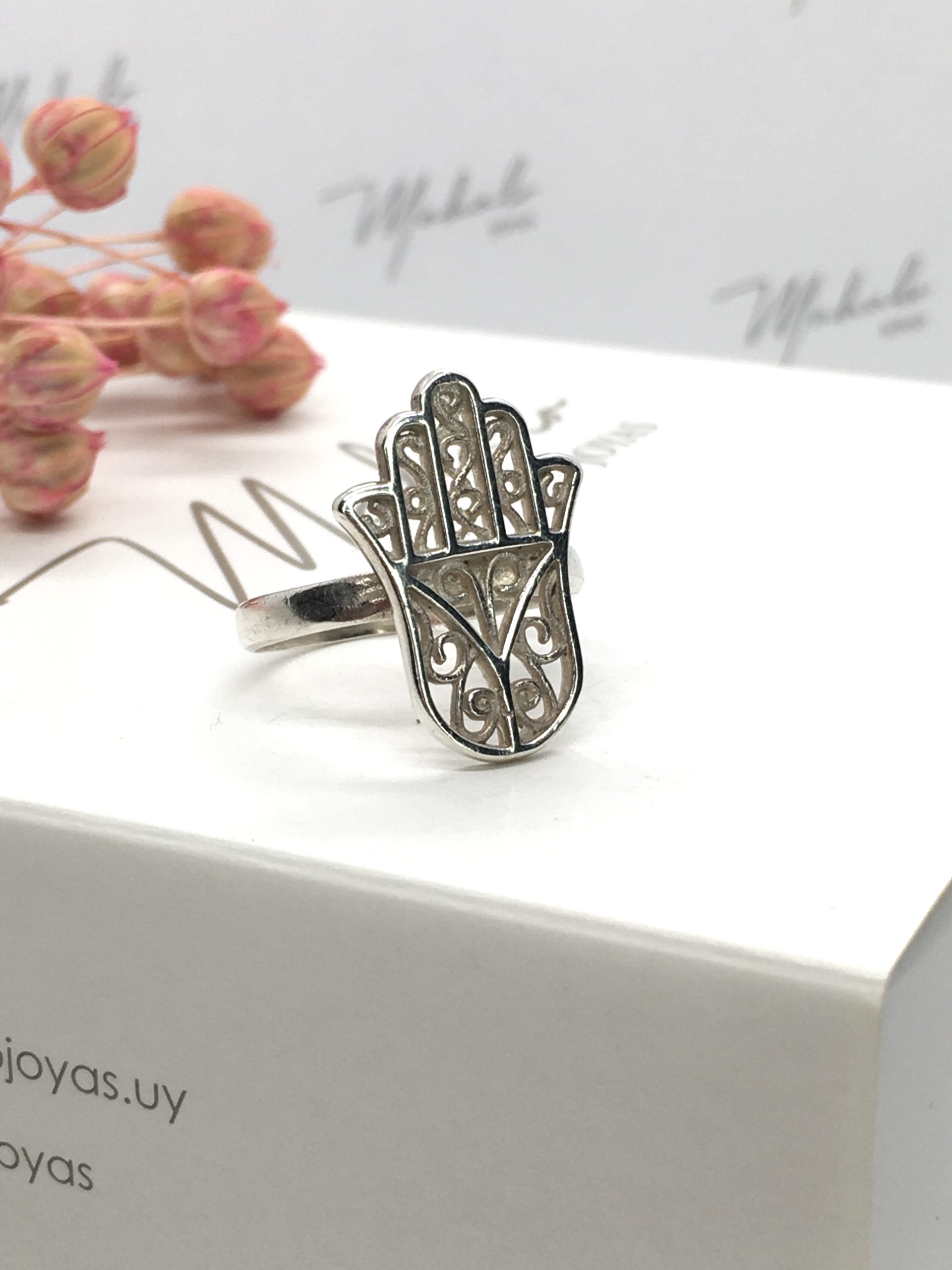 Anillo en Plata 925 con símbolo Hamsa calado. Amuleto protector, atrae la buena suerte y la abundancia.
