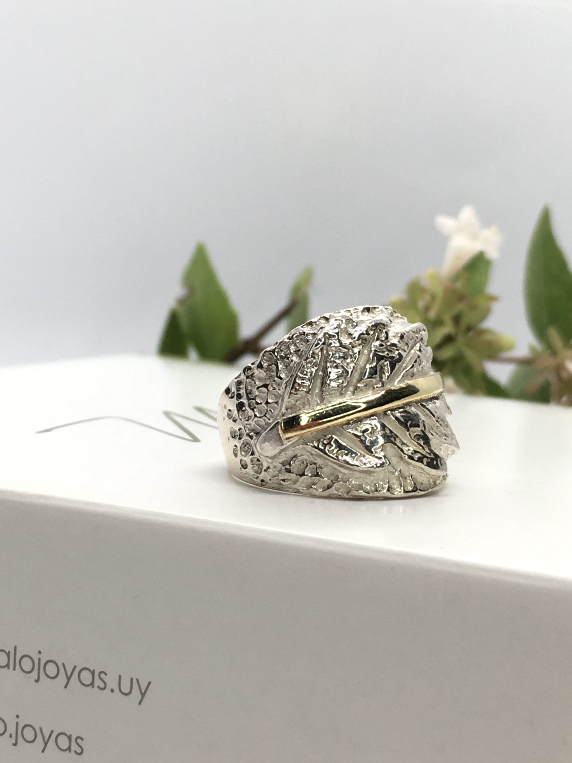 Anillo confeccionado en Plata 925 con aplique en oro con parte superior tallada en forma de hoja.