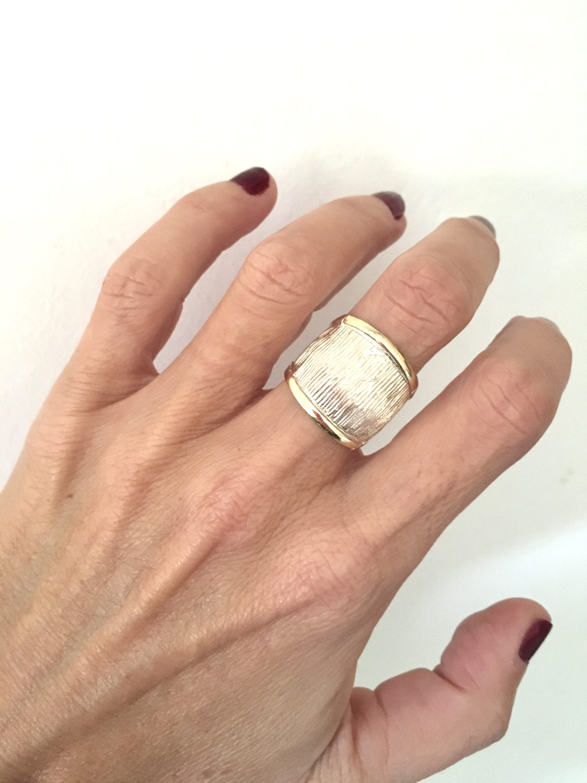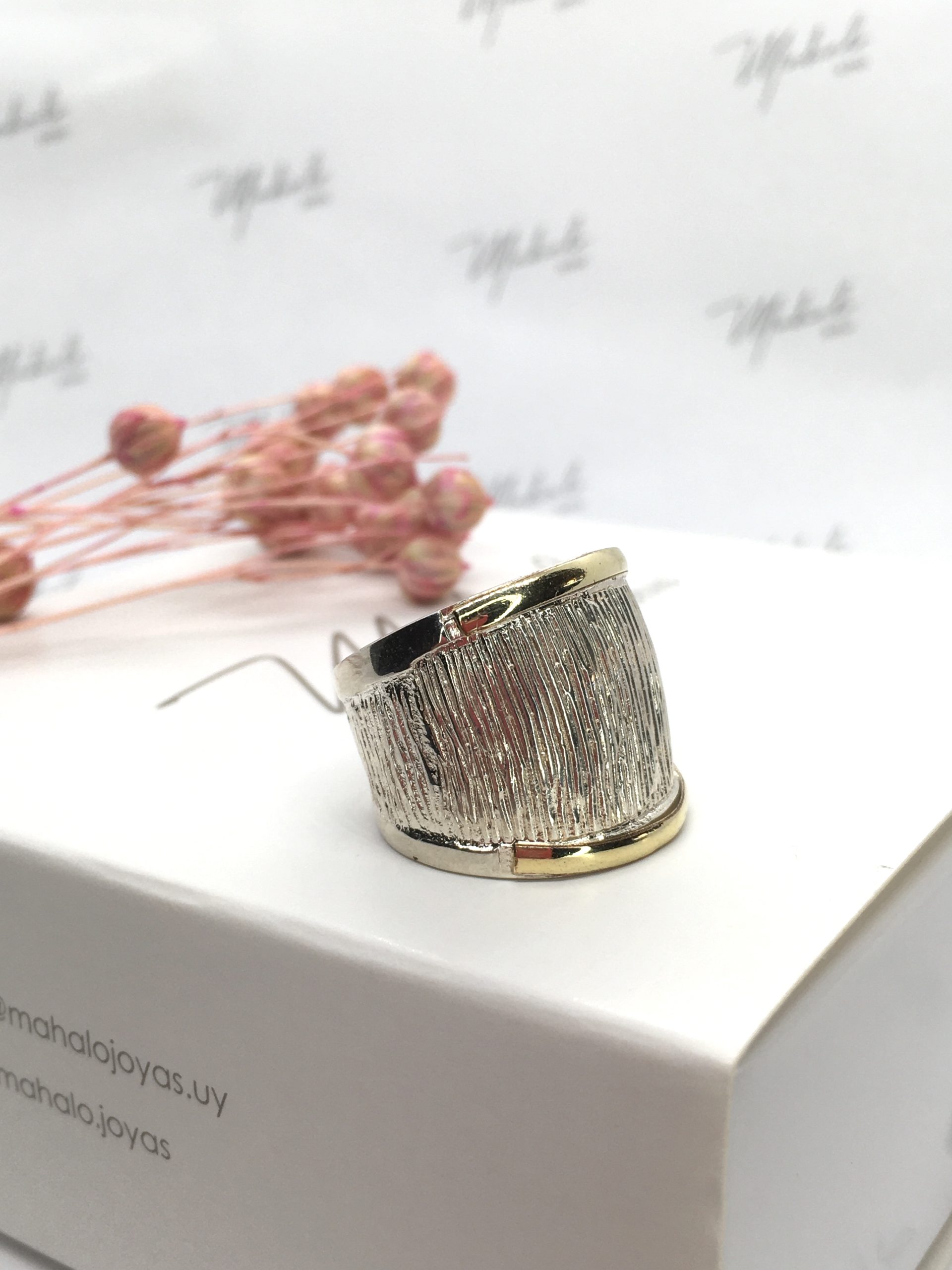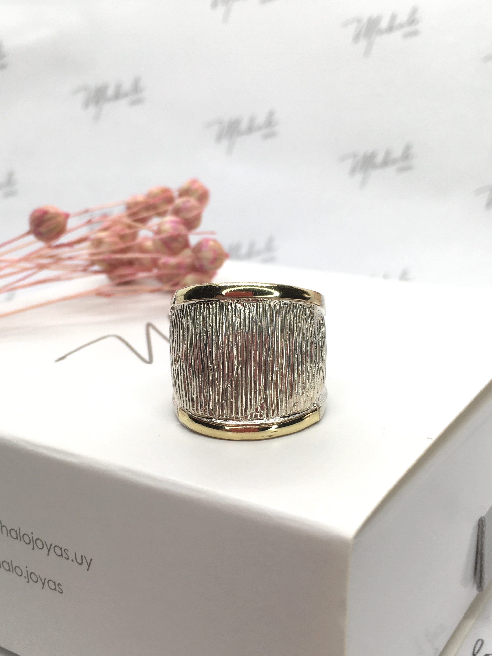 Anillo ancho confeccionado en Plata 925 y oro. Este anillo tiene un cuerpo importante, con su superficie rugosa en Plata 925 y bordes en doublé de oro.
