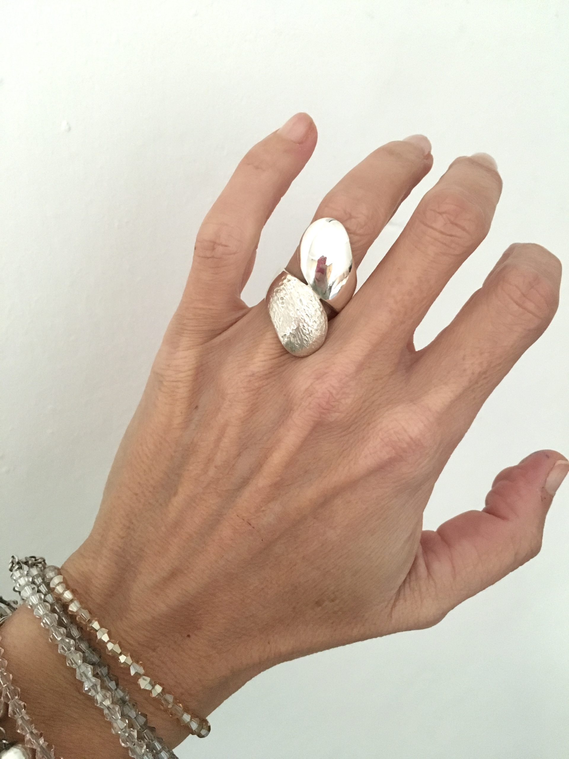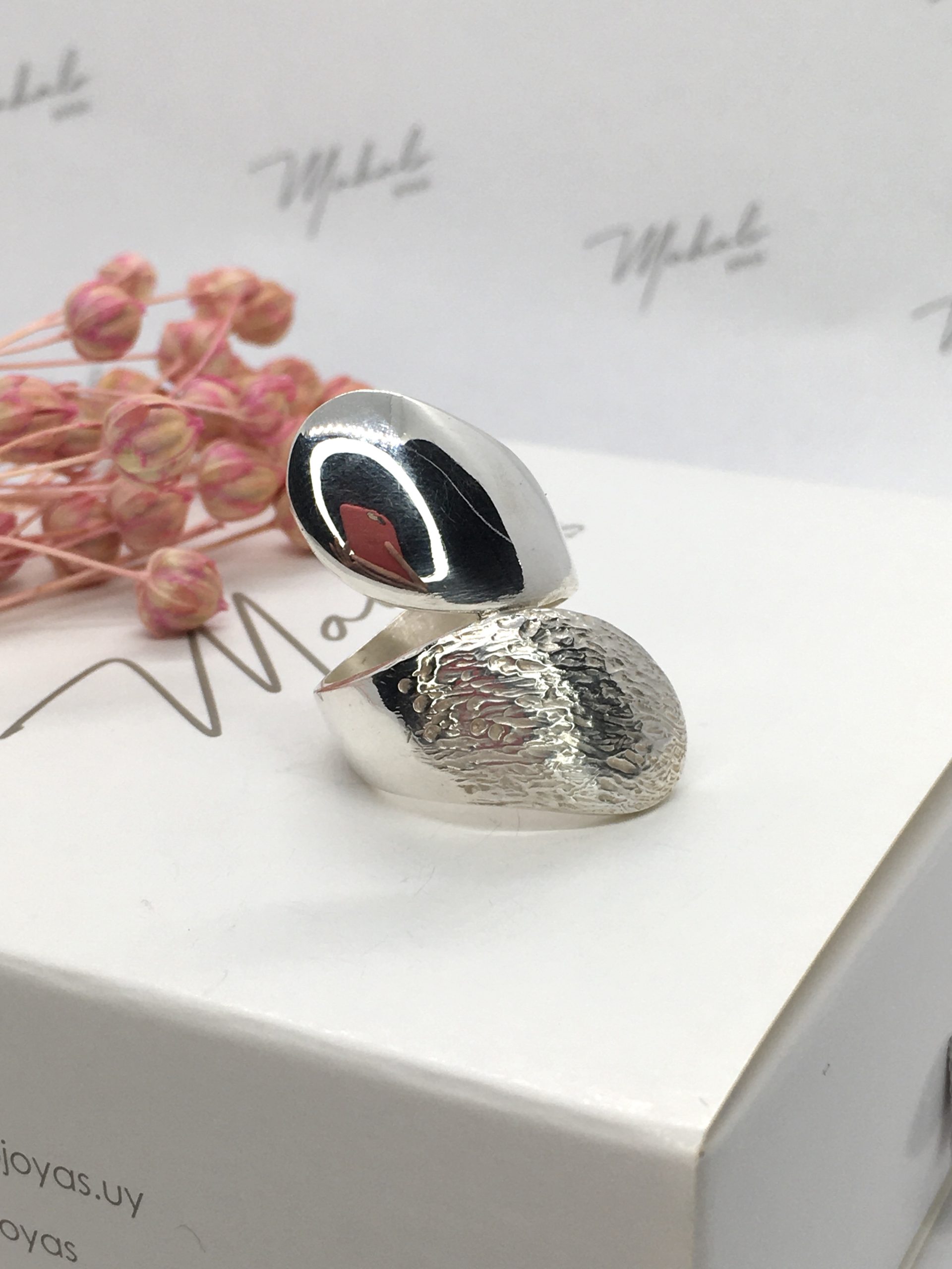 Hermoso anillo en Plata 925 en forma de pellizco, uno de los extremos en plata lisa y el otro en plata rugosa lo que le da un contraste llamativo.