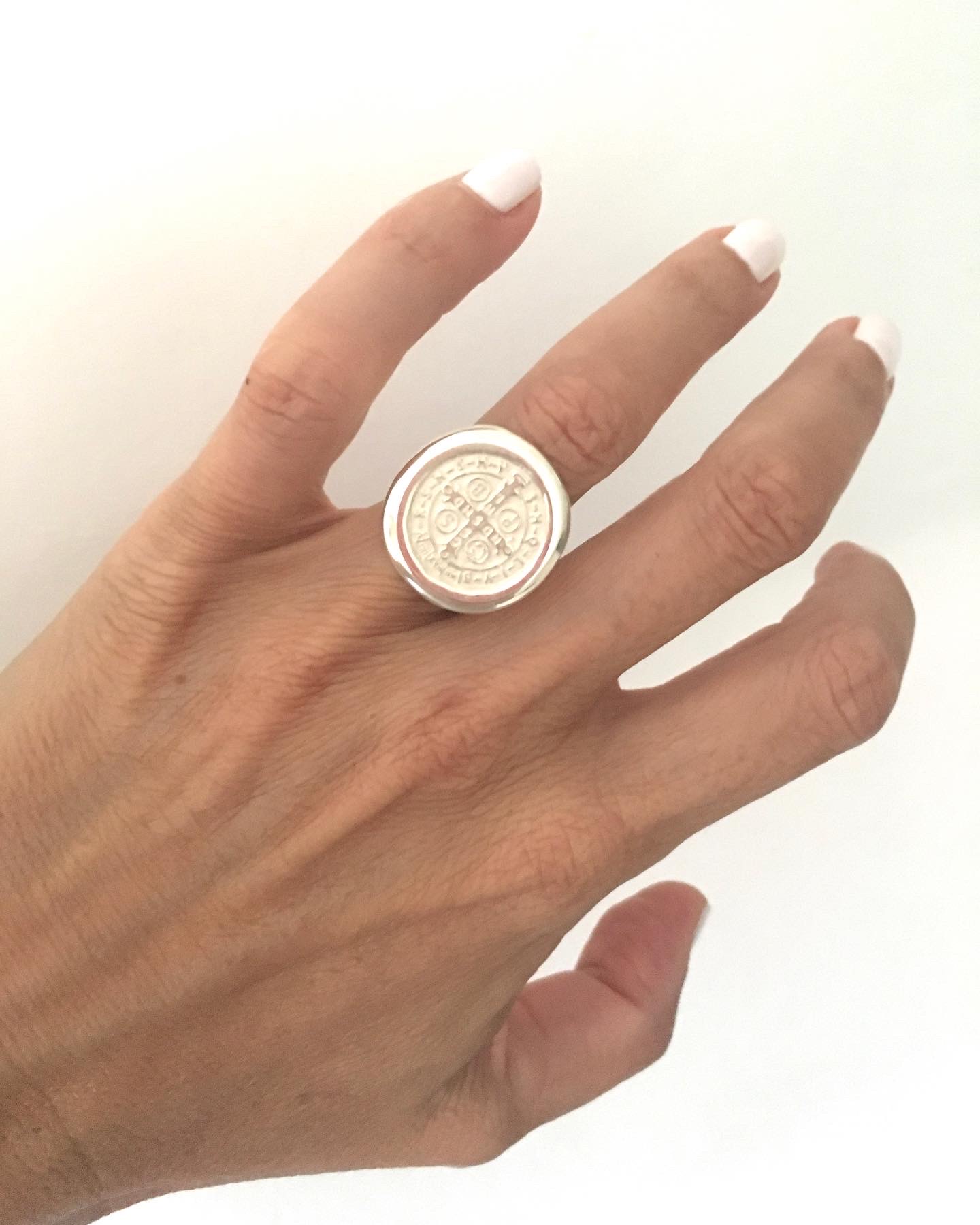 Anillo San Benito en Plata 925, diámetro de la medalla 22 mm.