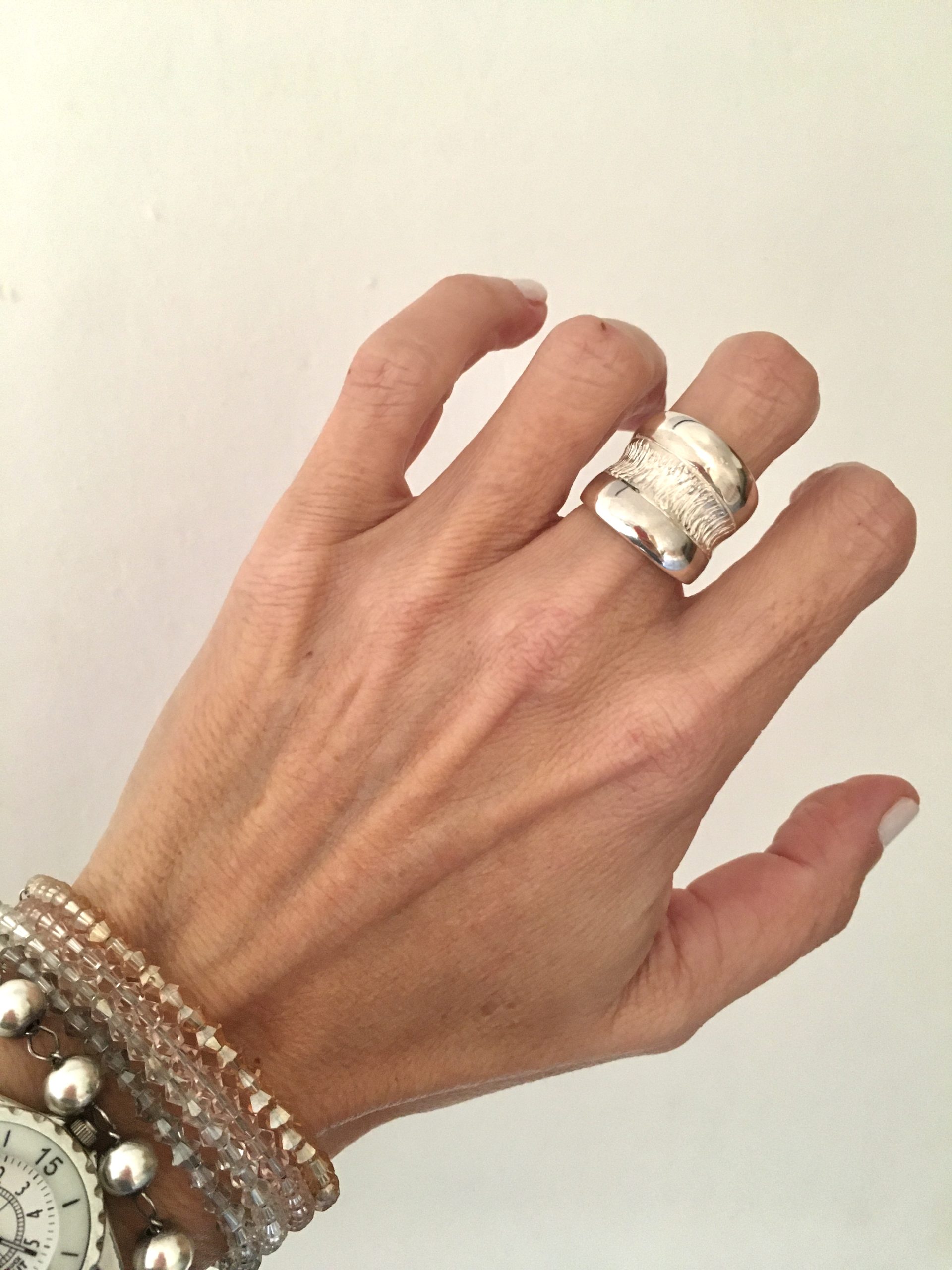 Anillo confeccionado en Plata 925, con un cuerpo importante, combinando el brillo de la plata pulida con una guarda de plata trabajada en el centro.