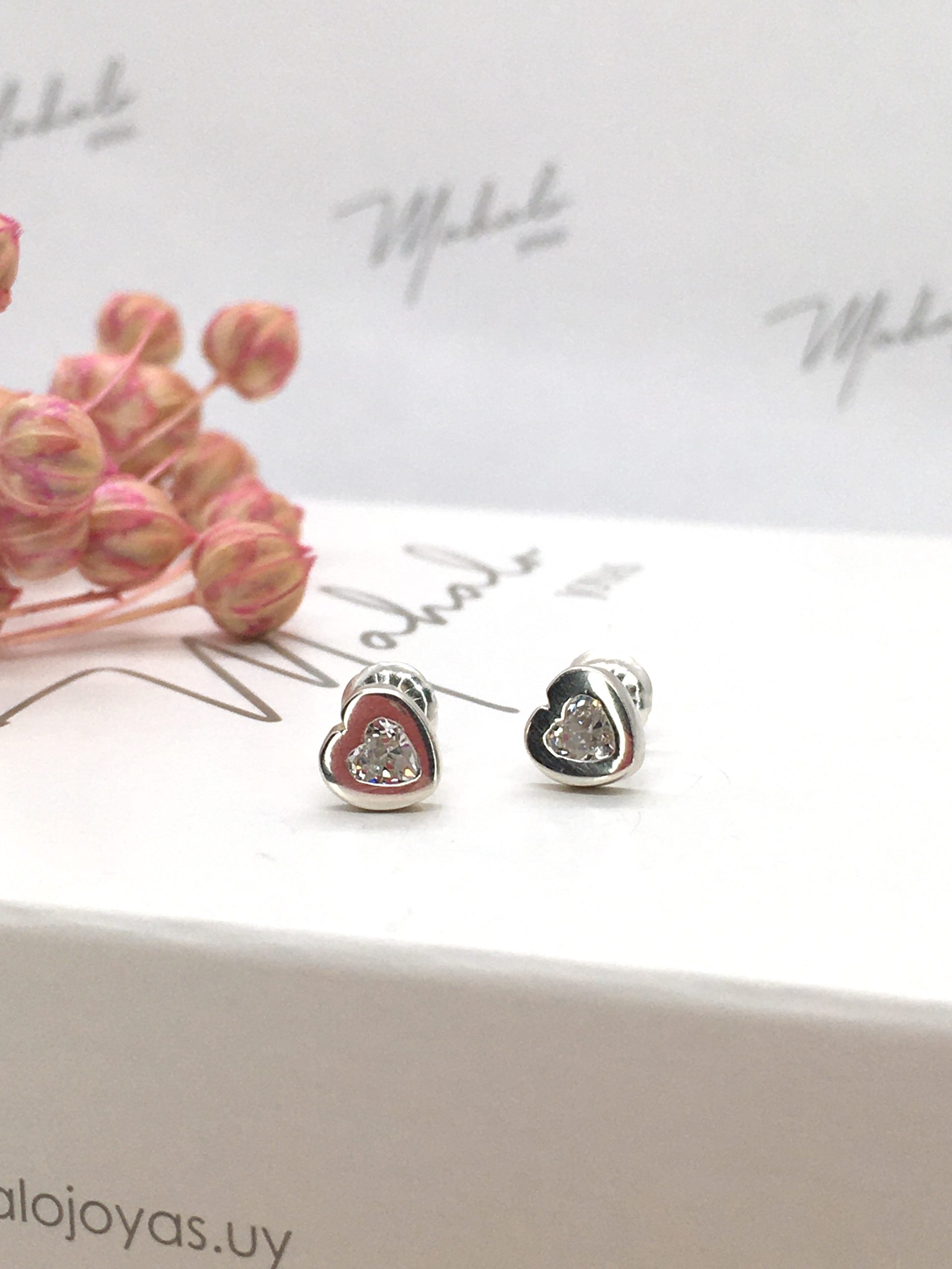 Caravanas confeccionadas en Plata 925 y circonias con forma de corazón. Sistema de cierre a rosca.