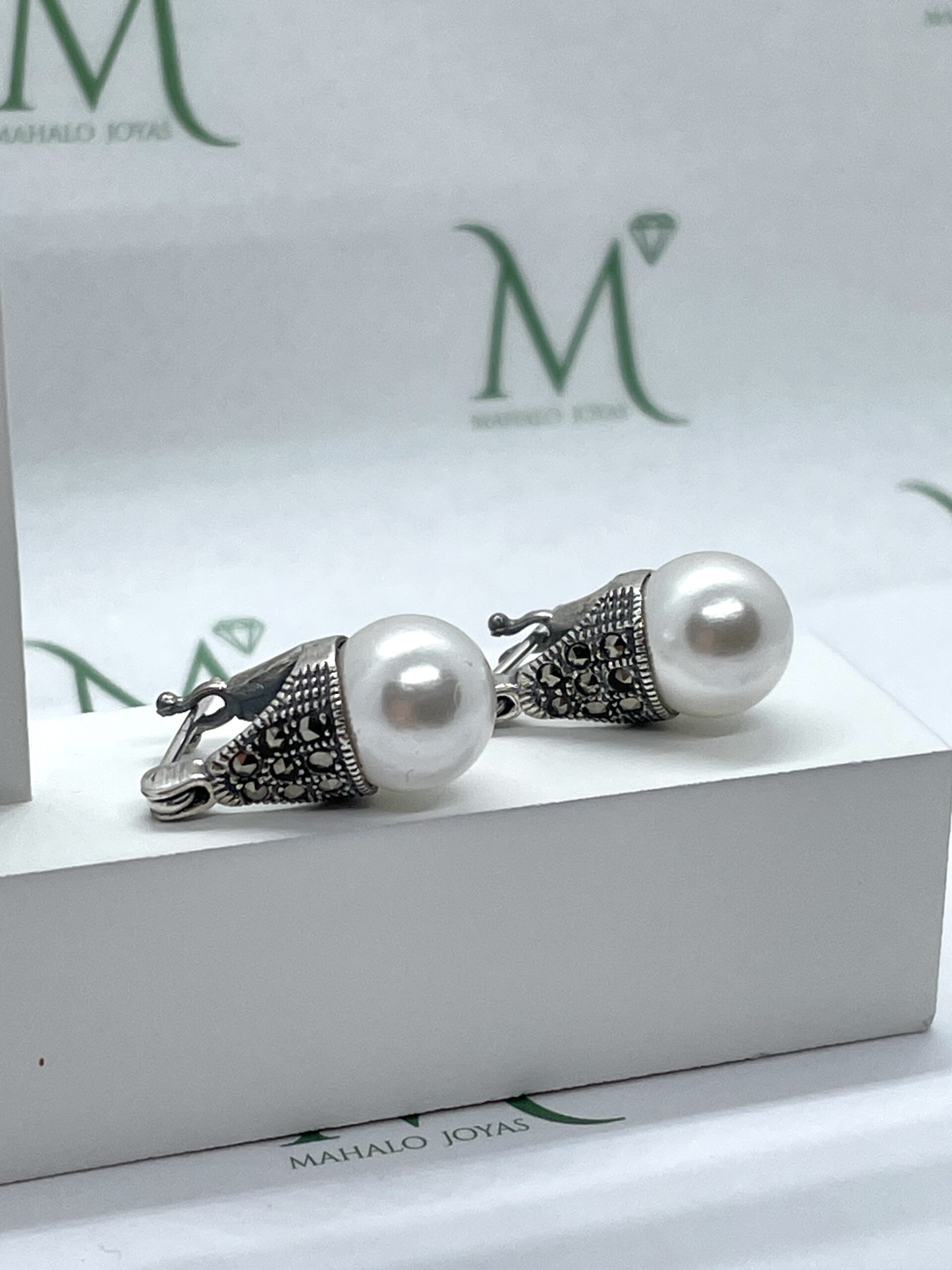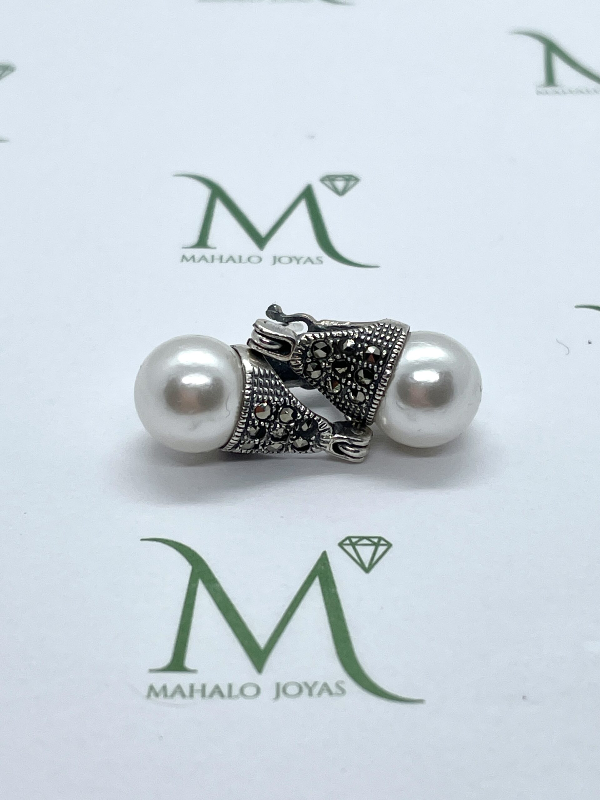 Caravanas en Plata 925 con marquesitas. Perlas sinteticas.