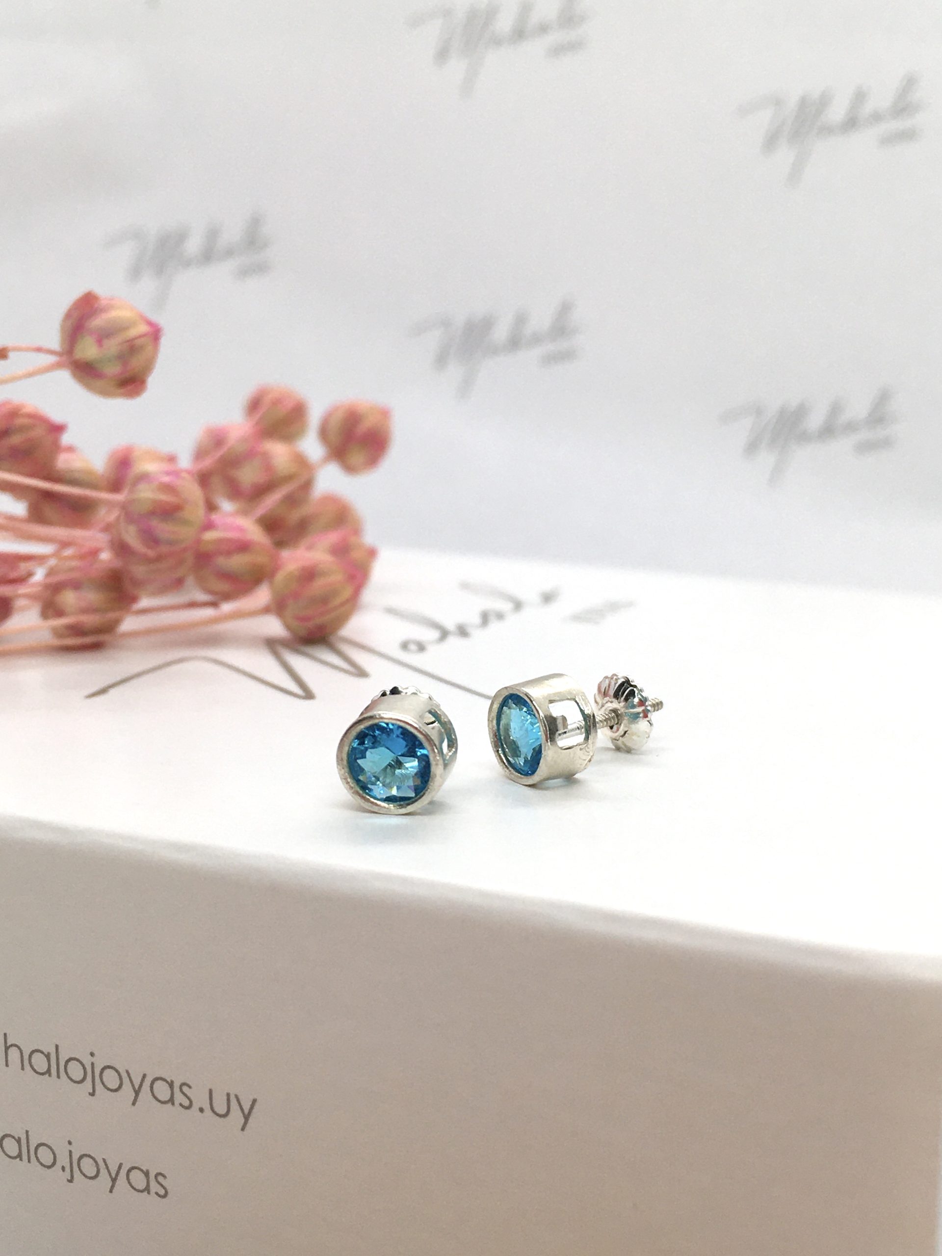 Caravanas punto de luz confeccionadas en Plata 925 y circonias celestes. Sistema cierre a rosca.