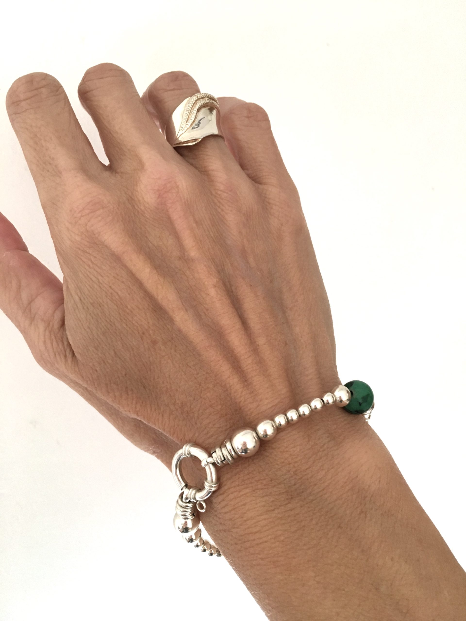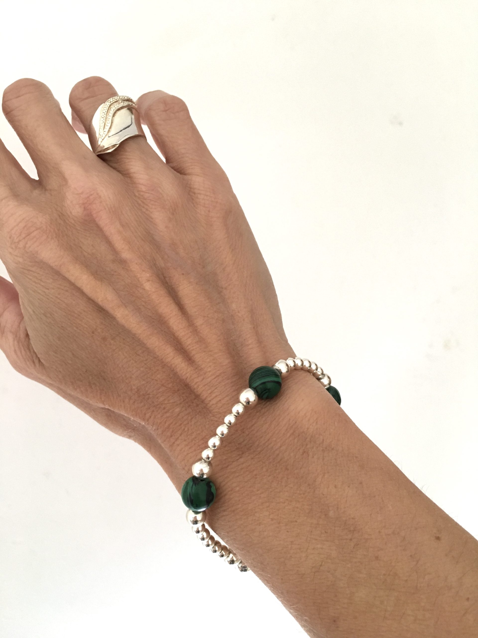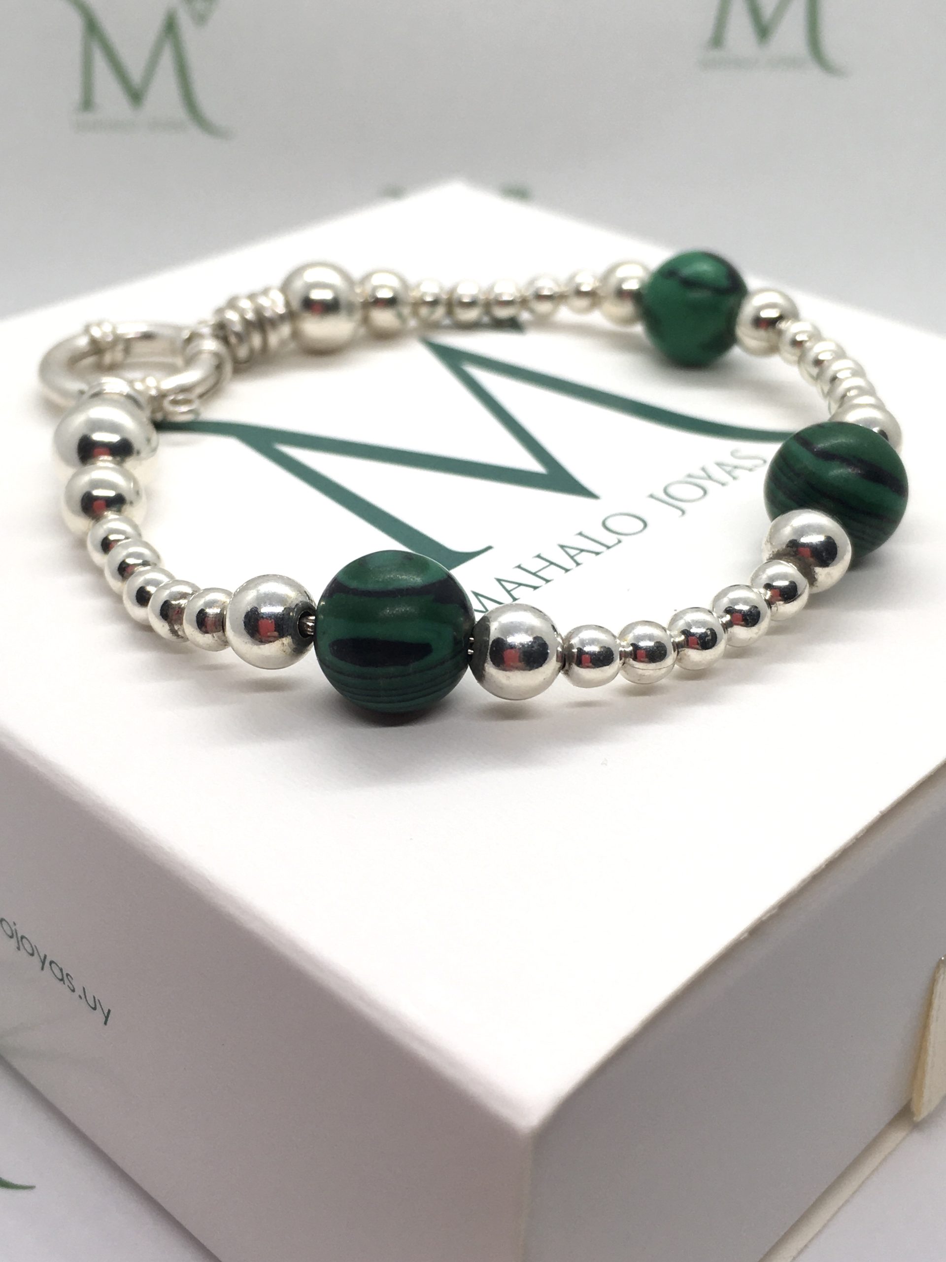 Hermosa pulsera confeccionada en Plata 925 con tres piedras de malaquita y bolitas de Plata 925. Cierre marinero.