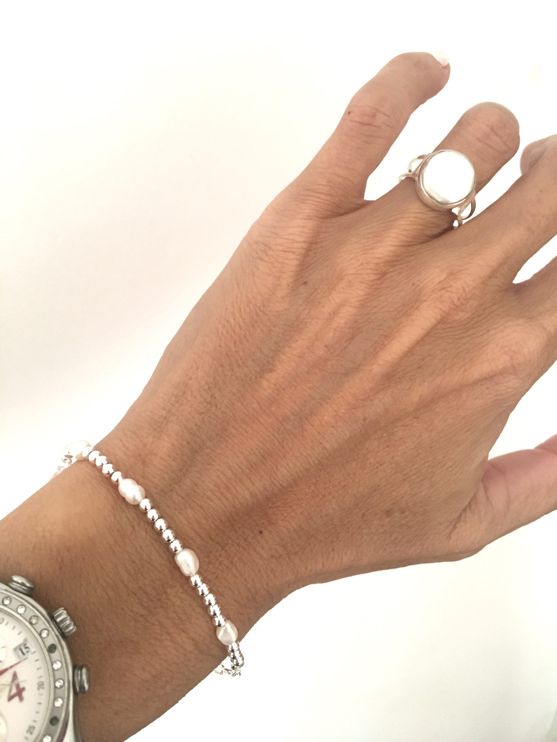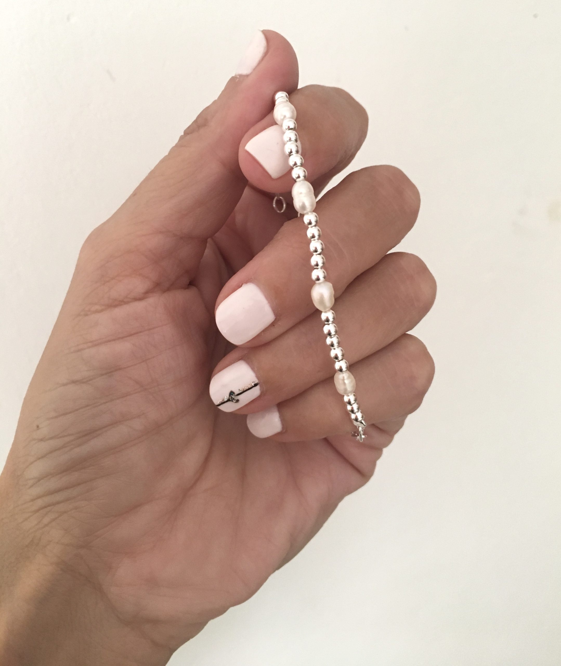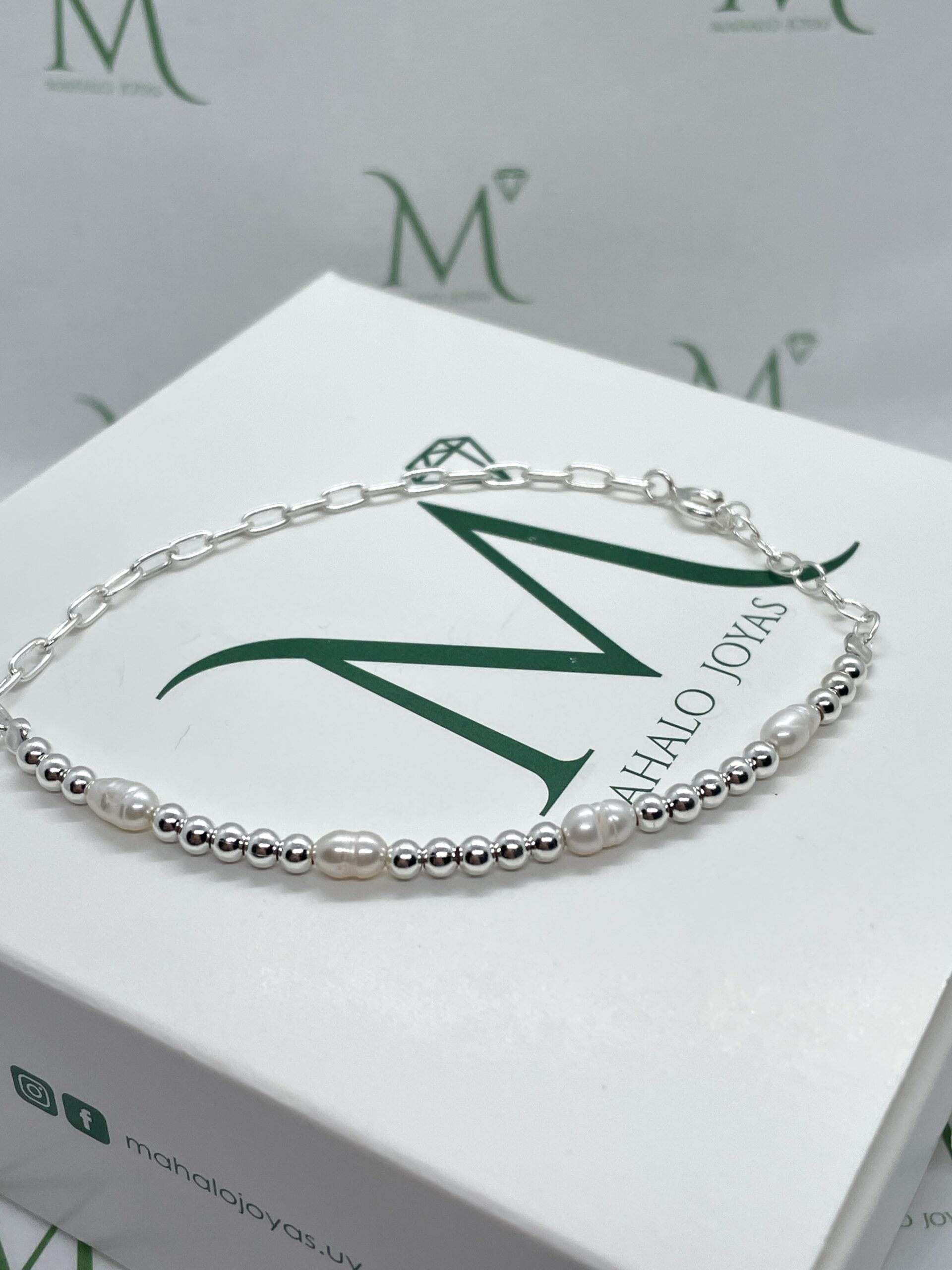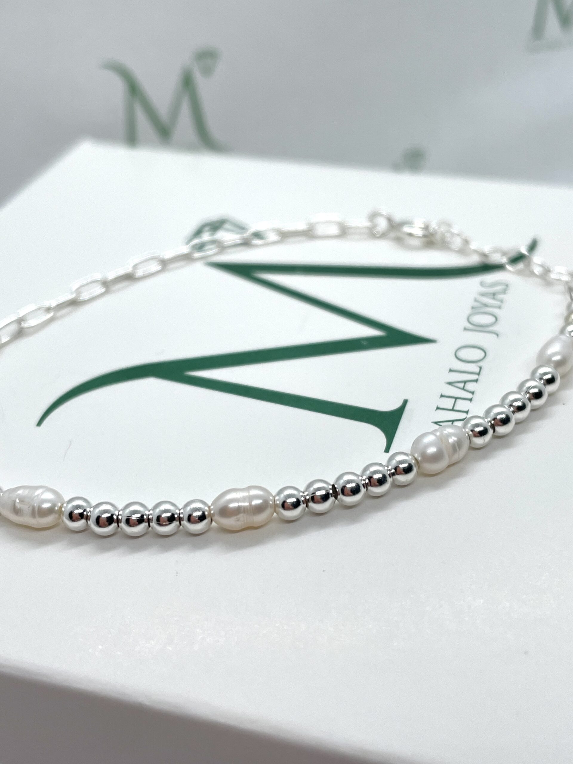 Pulsera en Plata 925 con bolitas de Plata y cuatro perlas de río. Uno de los extremos de la pulsera cuenta con una cadenita lo que permite ajustar su largo.