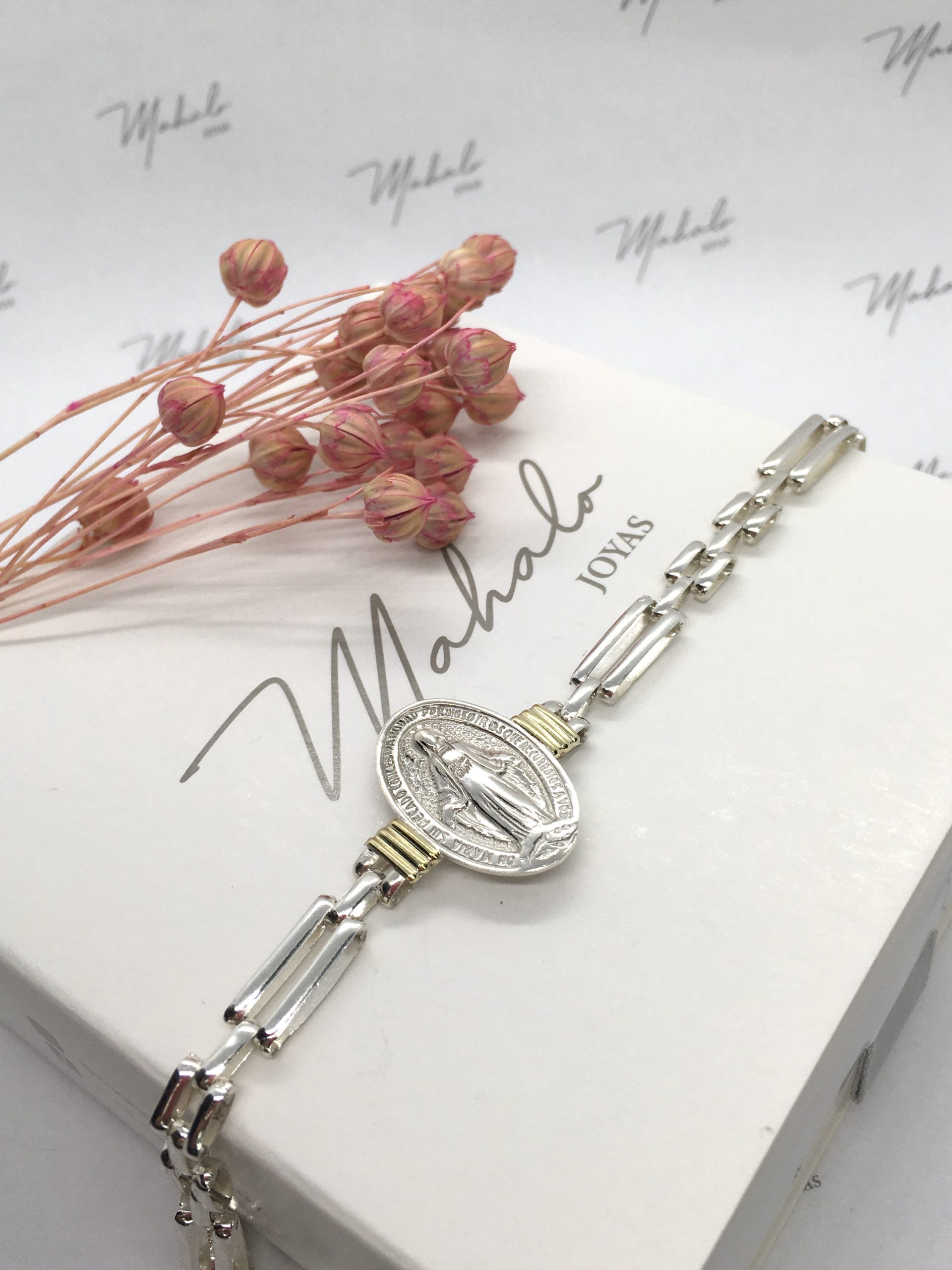 Pulsera confeccionada en Plata 925 y oro, eslabón panther con medalla de la Virgen Milagrosa.